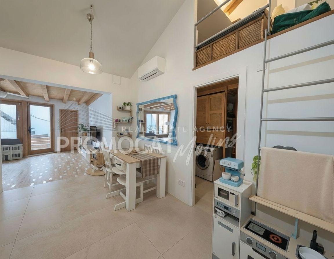 En aquesta primera zona trobem dues habitacions dobles, una amb vestidor, ambdues pensades per oferir el màxim confort. Tot seguit accedim a un rebedor interior que dóna pas al cor de l'habitatge: una cuina oberta amb zona de menjador, moderna i funcional, amb accés a un altell transitable, ideal com a espai auxiliar, despatx o zona d'emmagatzematge.